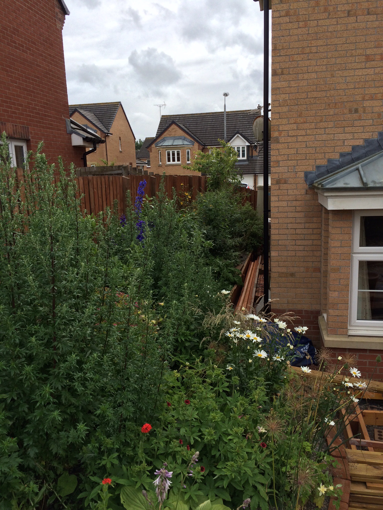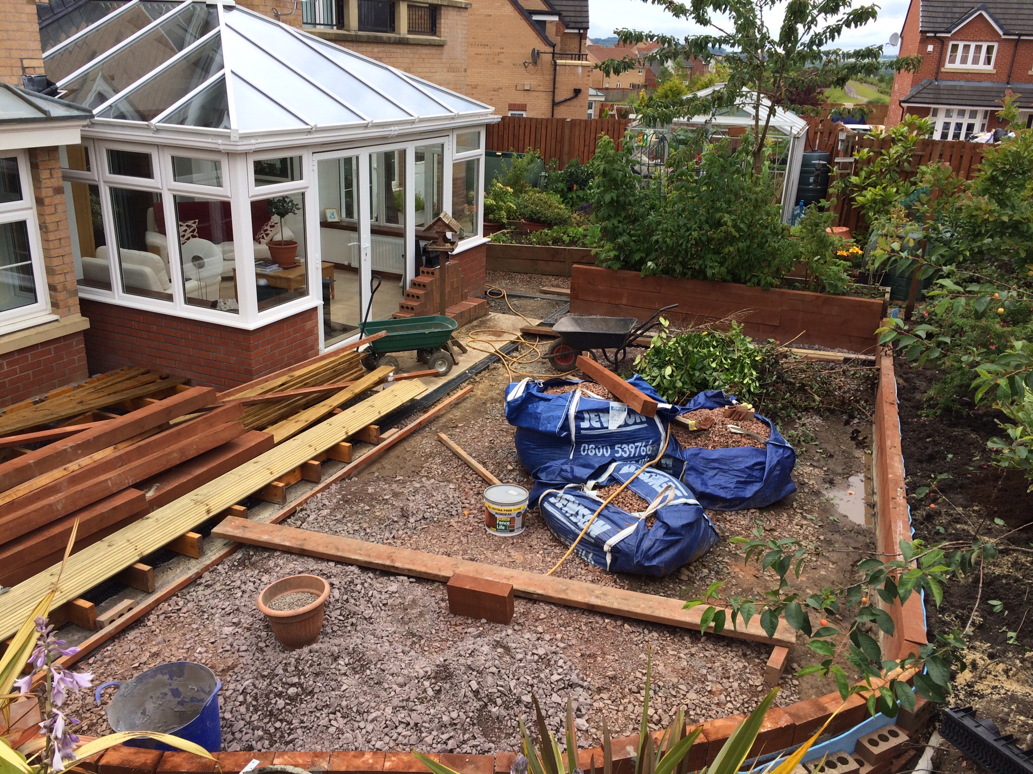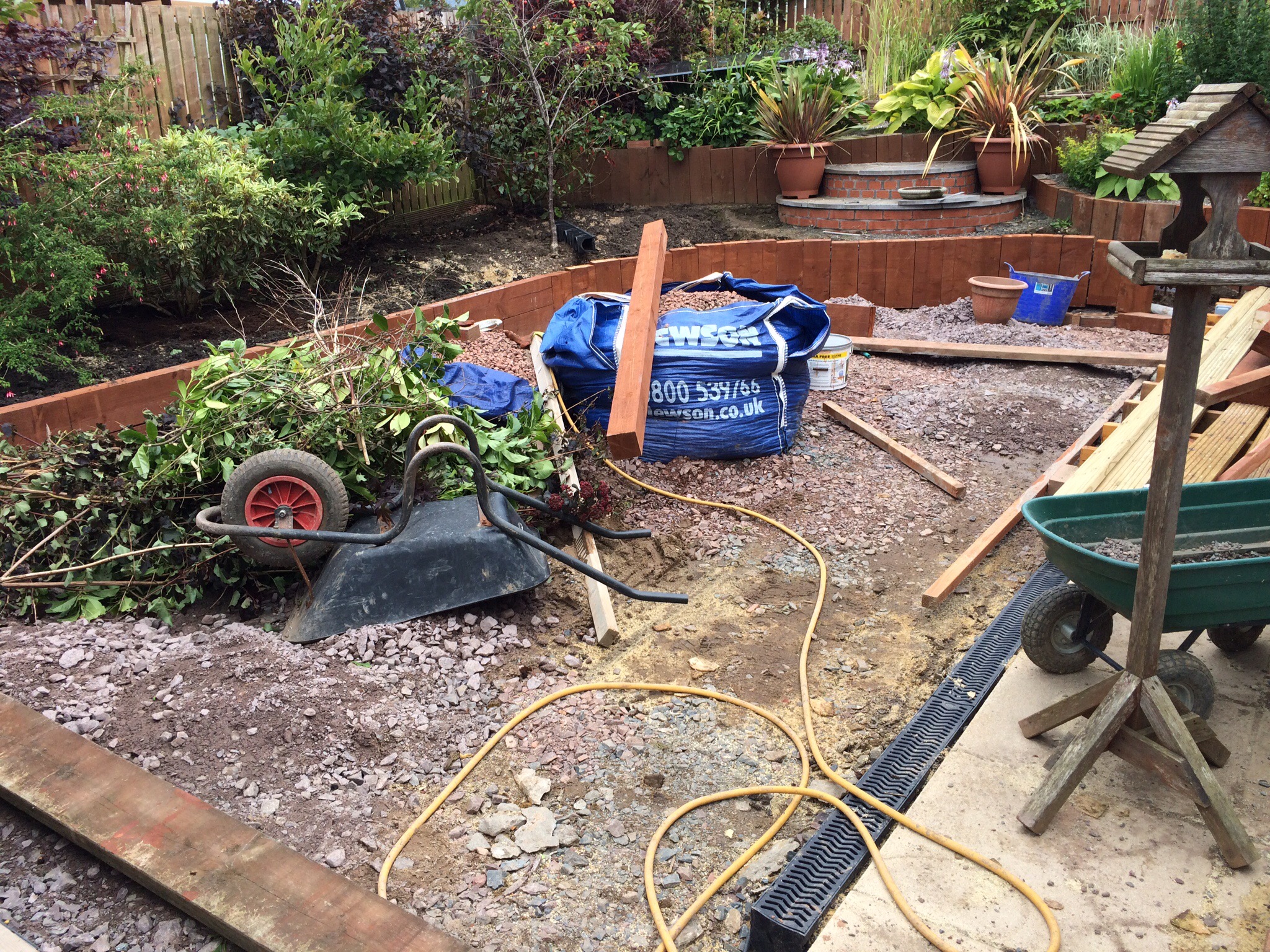 After a couple of weekends lost to monsoon season progress has been made. The sleeper wall is in across the back and nearly finished around the steps. The threat of more torrential rain has delayed the pouring of cement but the weight of the timber is stable enough in the short term.