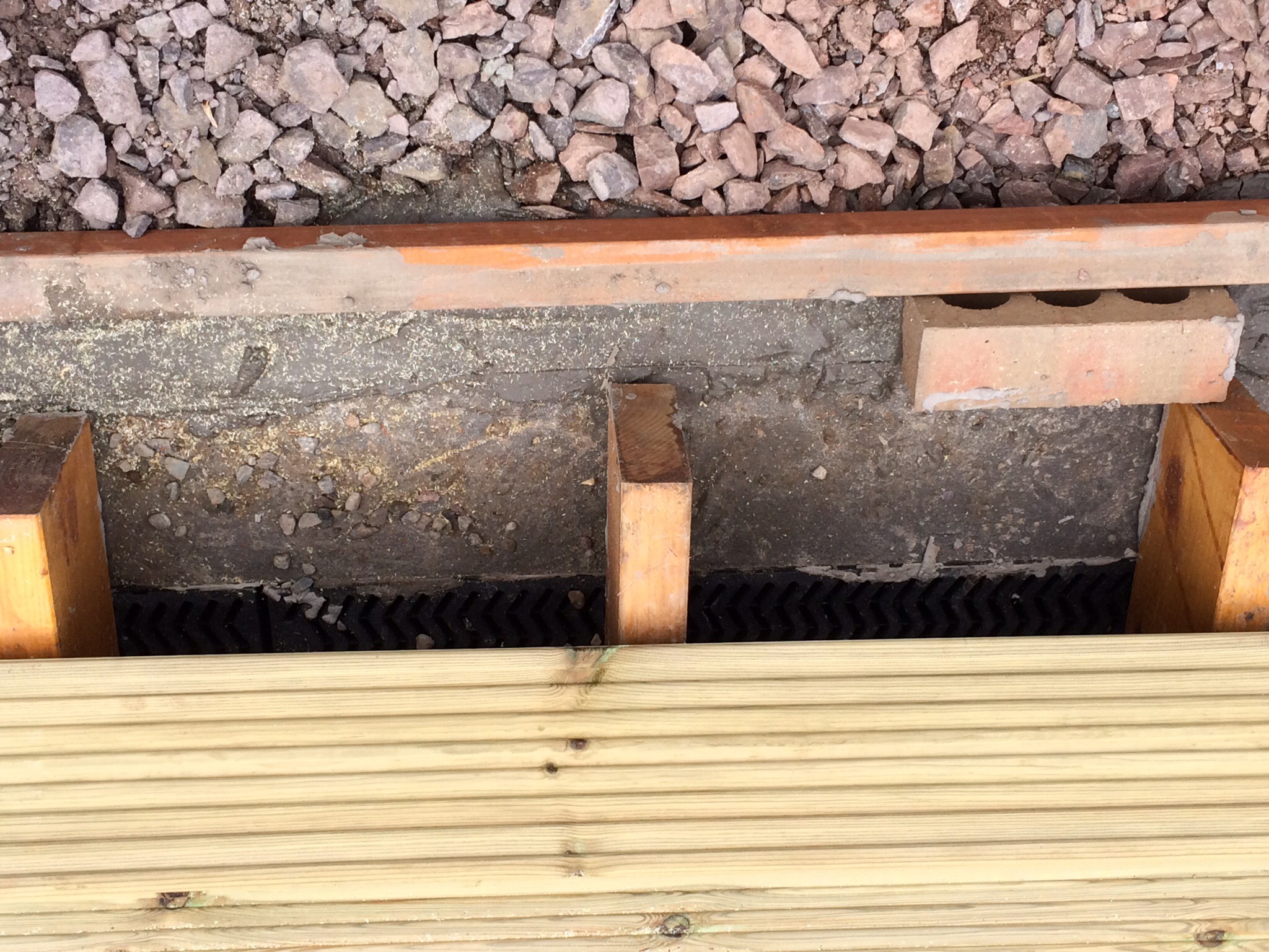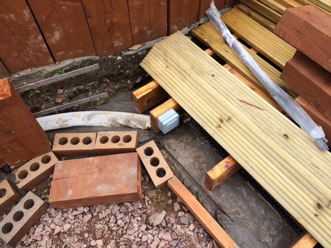 The concrete channels feeding the drains have set nicely and the profiling works as planned. Electrics are now in situ and deck boarding has stared, sadly not finished as it rained…