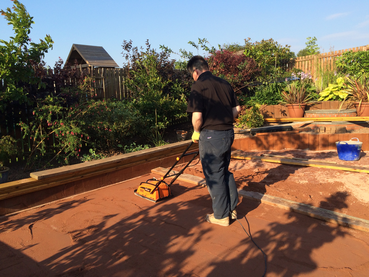Lurking under the sinister black plastic isn’t Fred West’s latest patio, but some nicely compacted grit sand, 11mm of shock pad. In summary the foundations for the lawn are nearly complete. Sadly darkness came before I was able to secure all the edges hence lots of wood holding things down until I get back from holiday.