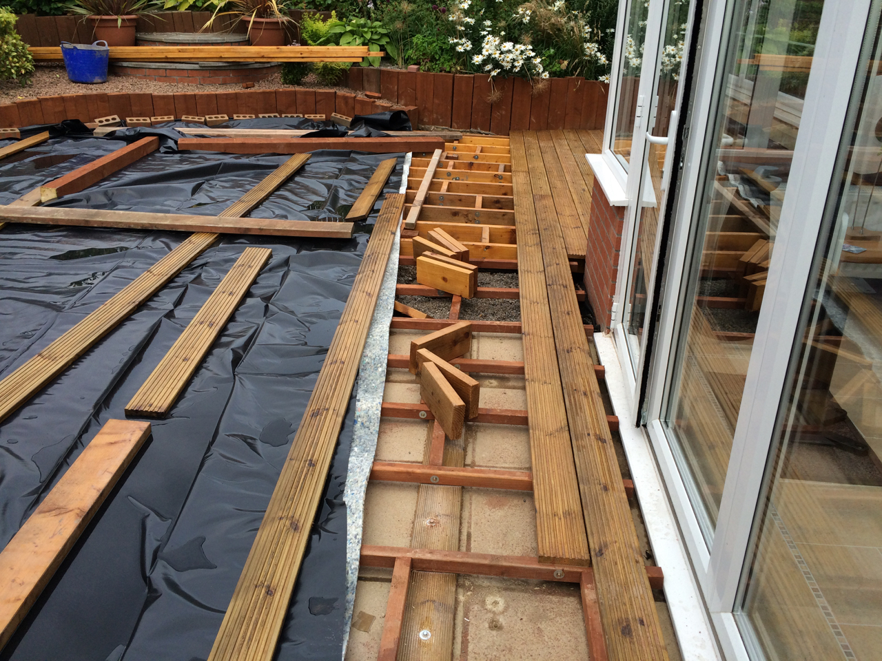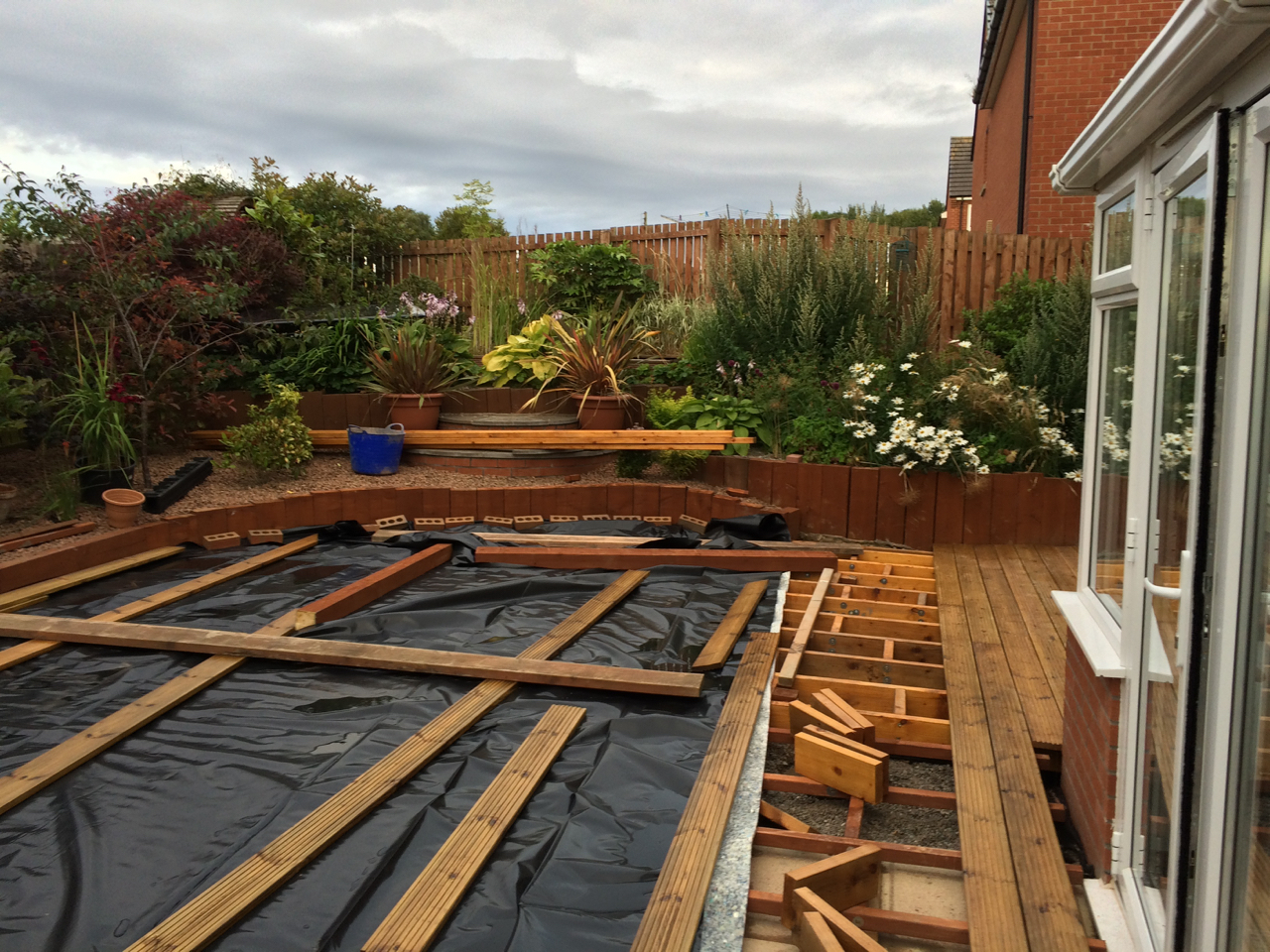Those equipped with short shooter eyes will also notice that some more decking boards have been fitted. The deck frame outside the conservatory has been bolted to the existing slabs and drainage holes drilled. All in all things are coming together. If only every weekend came with warmth and sunshine.